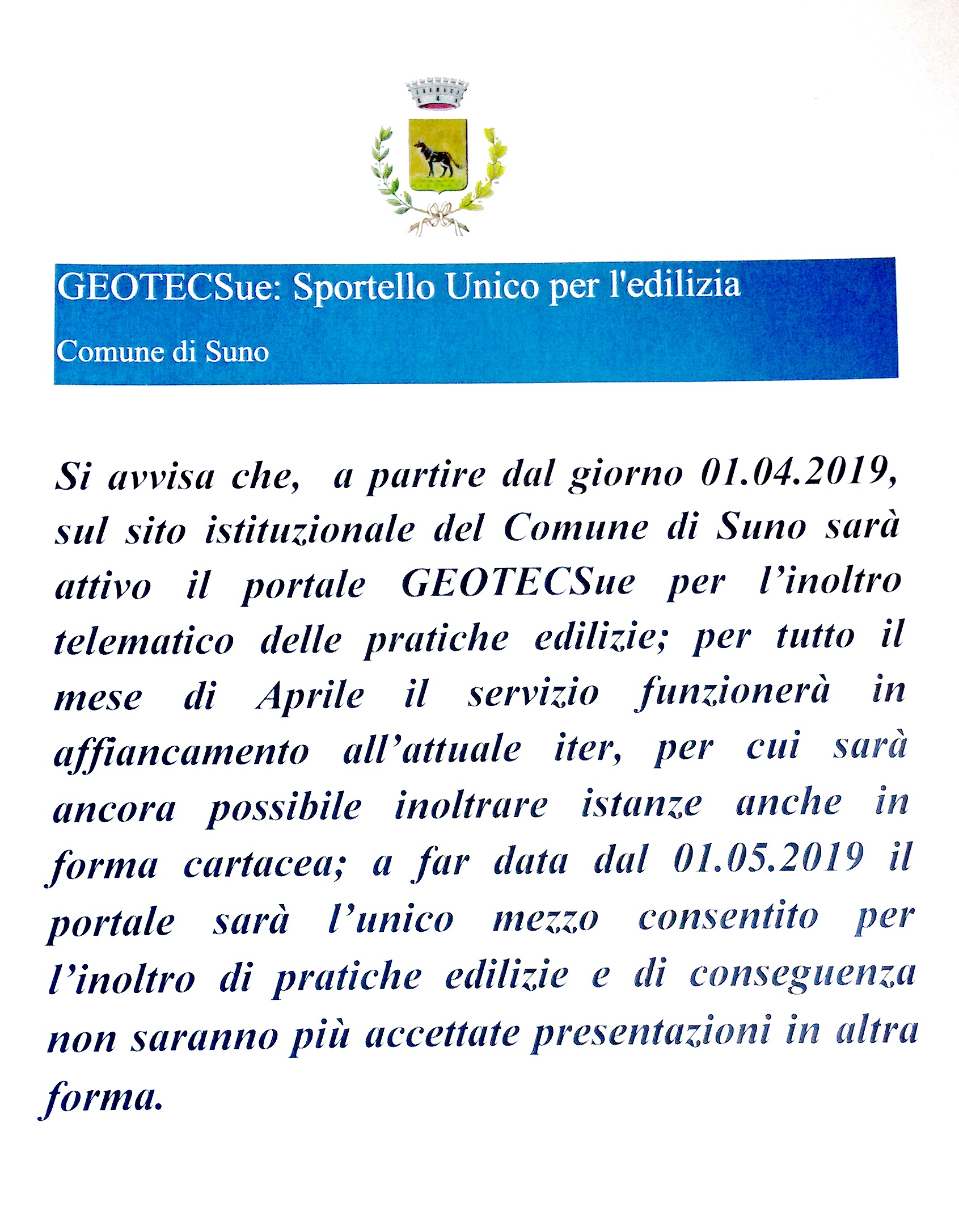 sul sito istituzionale del Comune di Suno sarà